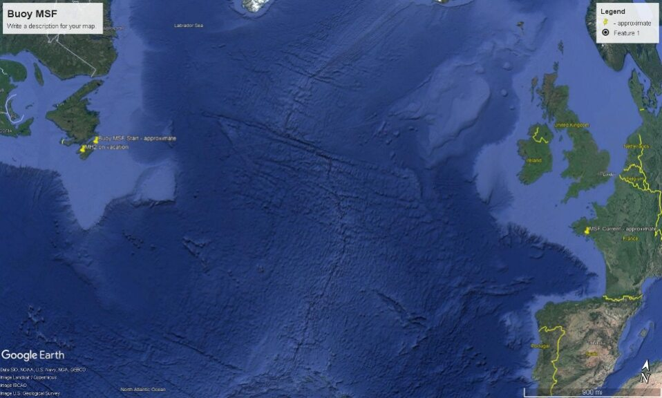 Les ressources présentes sur internet ont permis d’être mis en contact avec le surintendant du Groupe de l’infrastructure maritime et civile de la région de l’Atlantique de la Garde côtière canadienne. Une première visio a lieu avec lui permettant de confirmer que la balise a bien dérivé depuis le Canada (voir carte fournie par leurs services en illustration) et que les coûts logistiques de rapatriement vers le Canada ou d’envoi vers une entreprise spécialisée dans ce type de démantèlement sont importants.